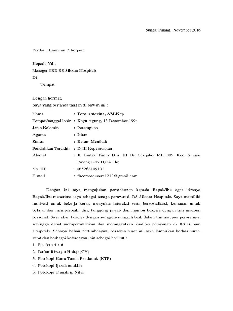 Kepada yth., manager hrd rs. Berikut contoh surat lamaran kerja bagi anda yang berminat bekerja di rumah sakit sebagai seorang perawat. Contoh surat lamaran kerja perawat di rumah sakit. Pada saat kita bermaksud ingin memberikan surat lamaran kerja ke sebuah perusahaan, tentunya harus disertai dengan amplop suratnya, . Atas perhatian bapak/ibu, saya ucapkan terimakasih. Beranda > surat lamaran kerja > contoh surat lamaran pekerjaan untuk di rumah sakit. Contoh surat lamaran kerja di rumah sakit bekerja di suatu rumah sakit tentu merupakan impian yang sangat besar bagi seseorang. Tentang masa depan yang diharapkan tindakan pengirim/penerima akan . Setelah kita membahas mengenai contoh surat lamaran kerja yang baik dan. Pt, cv, bumn, rumah sakit, umum, dll. Fatmawati, jakarta dengan hormat, yang bertanda tangan dibawah ini Bagian bidan, administrasi, perawat, rumah sakit negeri dan swasta. Contoh surat lamaran pekerjaan untuk di rumah sakit.